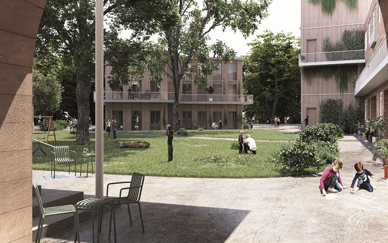 Der Innenhof bietet abwechslungsreiche Freiräume mit sich öffnenden Sicht- und Wegebeziehungen. Ein Großteil der prägenden Bestandsbäume bleibt erhalten und wird in das Freiraumkonzept integriert.